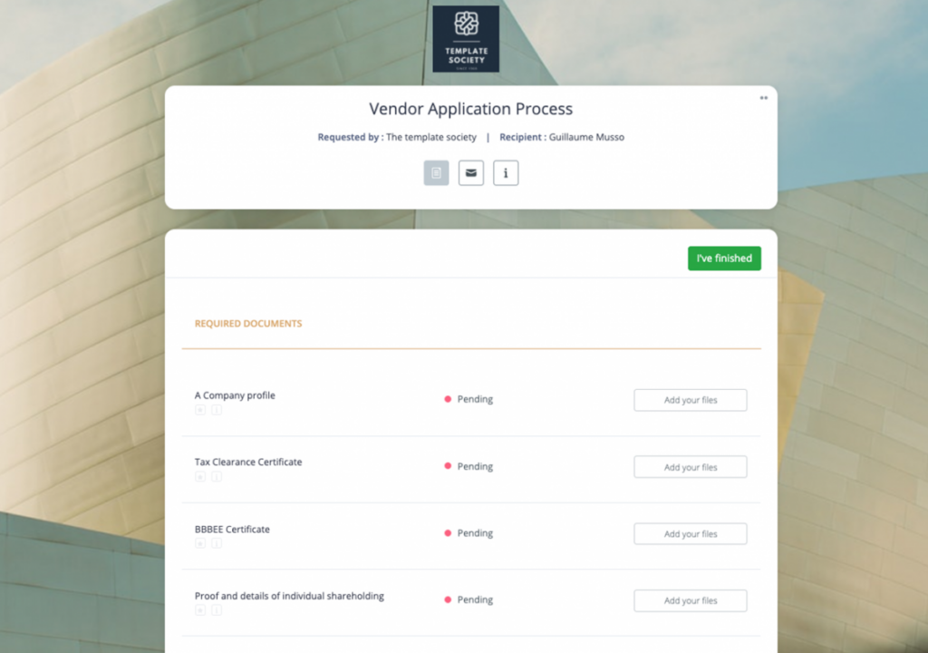 A vendor registration form helps you collect their details with a pre-check form. The document checklist helps you collect all the files you’ll need from a new vendor. Some documents you can collect are certificates of incorporation, shareholder registry, bank account statements, owner’s passport, memorandum of association, and more.