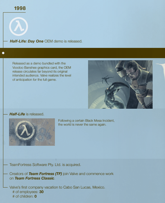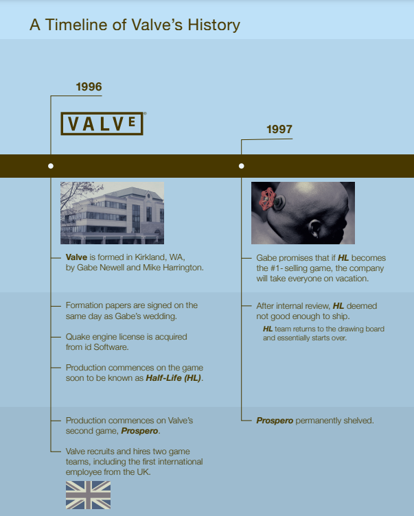 Take for example, “A Timeline of Valve’s History” from the pictures below. They paint a picture of the company’s first major success, outlining the motivation for the employees back then was the company’s promise to take everyone on a vacation if their project Half-Life becomes the #1 selling game.