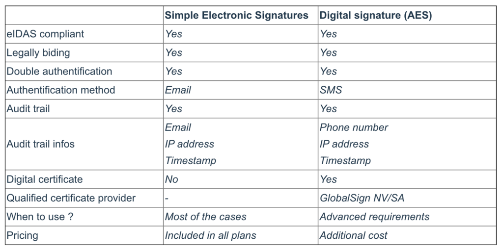 Clustdoc provides two types of e-signatures following eIDAS requirements : Simple Electronic Signatures and Digital signature (AES).