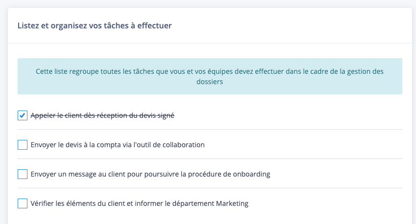 Les échanges avec le client : Informez le client de manière régulière et planifiez des points pour le garder engagé et confiant. Communiquez en toute transparence les prochaines étapes et les dates clés associées à la gestion de son entrée en relation.