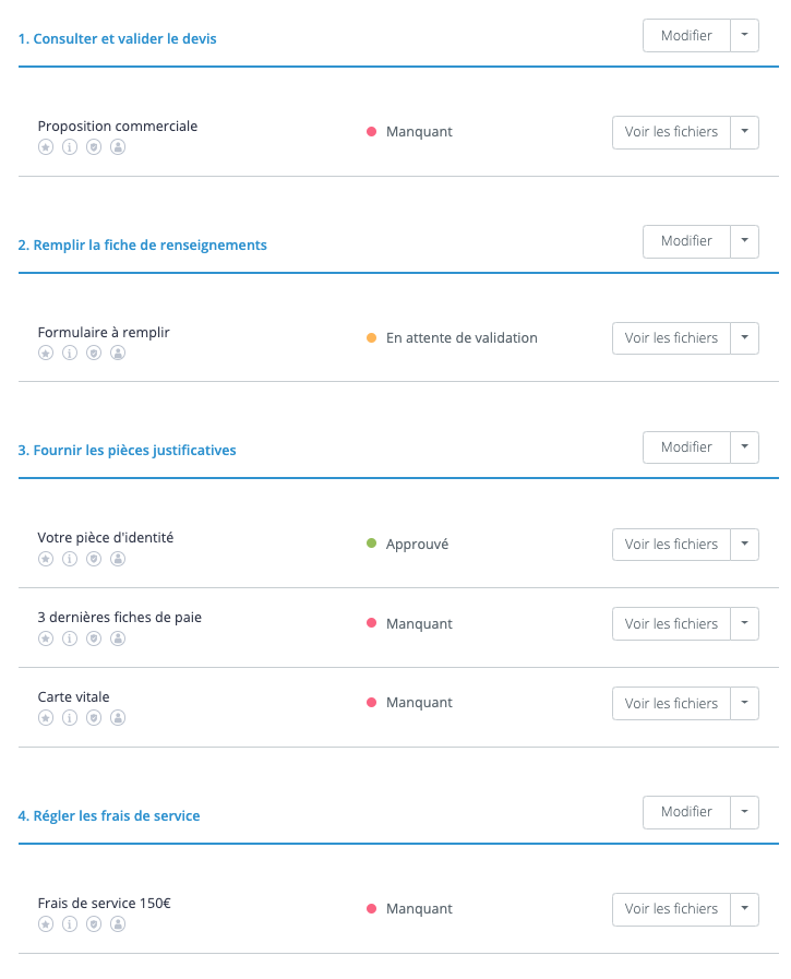 Vous pourrez y transférer vos actuelles listes de pièces à fournir, vos formulaires de renseignement et vos différentes requêtes (demandes de paiement ou de signature) dans une checklist digitale et facile à naviguer avant d’inviter le client à rejoindre un espace à vos couleurs pour démarrer la procédure.