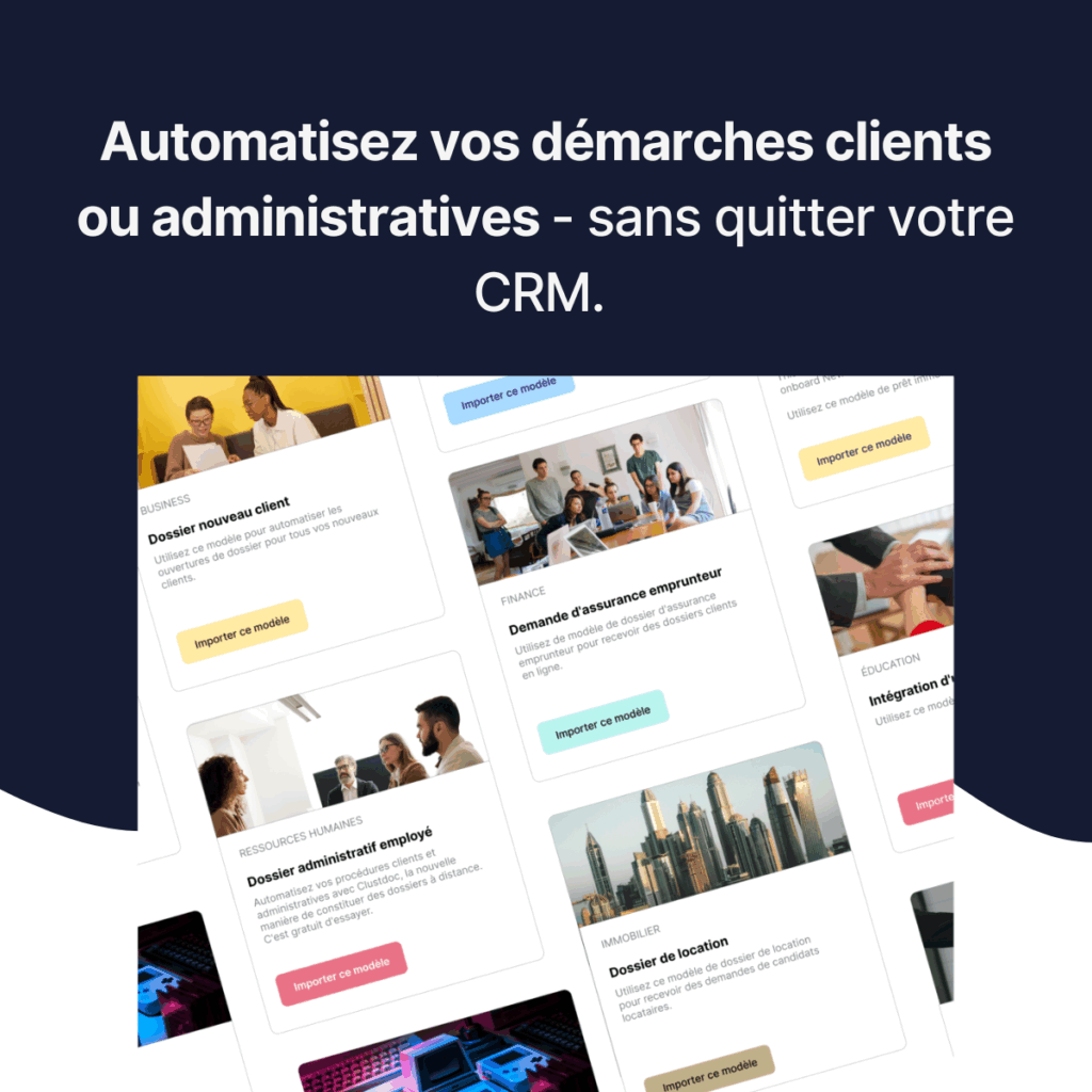 Bien que Clustdoc ne rentre pas dans la stricte définition d’un CRM, nous avons remarqué une certaine créativité de la part de nos clients pour ce qui est des règles d’automatisation possibles avec un portail client sécurisé, (Et ce avant même que notre application ne soit disponible sur Zapier). Je suis certaine que vous en trouverez d’autres :