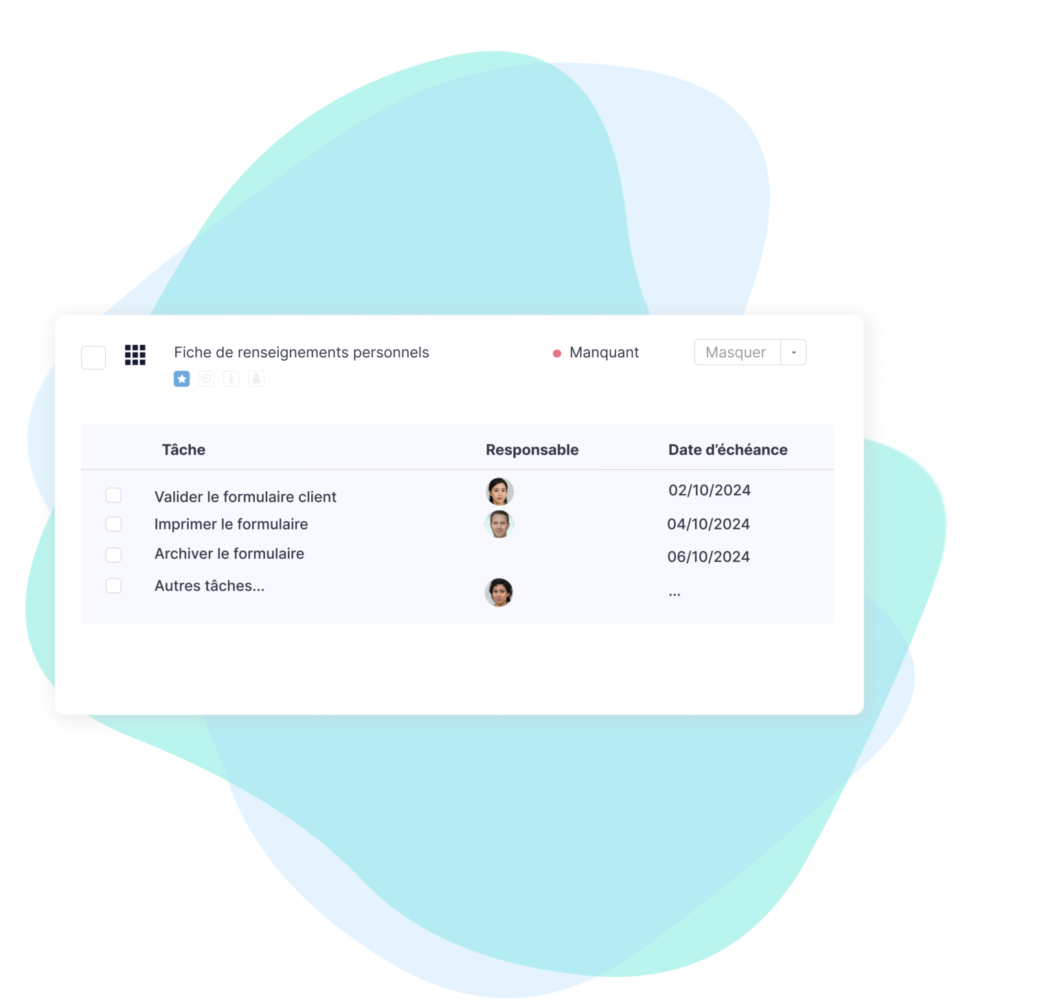 Une fois les informations collectées auprès de vos clients dans un espace collaboratif sécurisé, votre équipe peut prendre le relai et travailler ensemble sur chaque dossier.